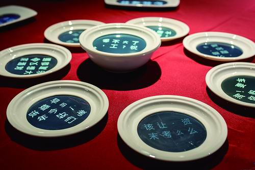 在展厅一角,一张铺着红布的圆桌吸引了多人驻足。桌上餐盘内装的并非佳肴,而是一块块屏幕。其中显示的,有“好久没回家”的感慨、“祝大家新年快乐”的祝福,也不乏“新车多少钱”“期末考多少分”的问询。作品名称叫《团圆》。当观众围绕圆桌,将触发相应的感应装置,导致桌子倾斜,桌上餐盘屏幕话语也会切换、变形和重组。