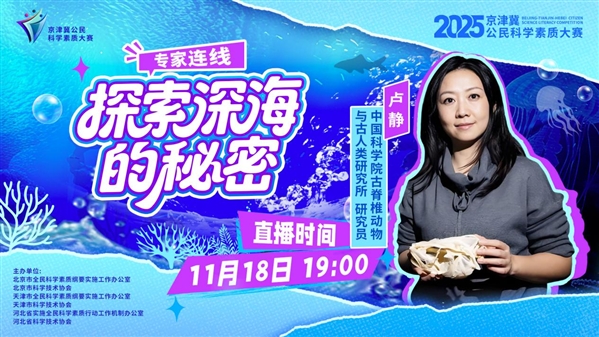2025年京津冀公民科学素质大赛专家连线第四期,邀请到中国科学院古脊椎动物与古人类研究所研究员卢静,带领大家开启一场沉浸式深海探秘之旅。依托极具科研价值的深海生物标本,卢静研究员将结合自身专业研究成果,分享藏在深海中的奇妙生物故事、解读亿万年中生命从海洋走向陆地的演化密码,还将引领大家循着演化脉络,探寻人类在漫长岁月中的演化轨迹。