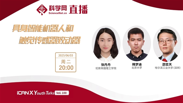 北京时间6月3日晚八点,iCANX Youth Talks第100期邀请到了帝国理工学院生物医学机器人讲师张丹丹,北京大学助理教授韩梦迪,哈尔滨工业大学(深圳)教授邵奕天担任主讲,大连理工大学教授刘倩担任研讨嘉宾,北京航空航天大学教授王党校担任主持人,期待你一起加入这场知识盛宴。