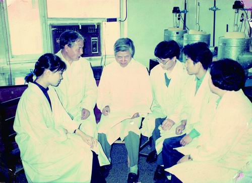 1988年,蒋民华(右)与美国杜邦公司的科研人员交流。