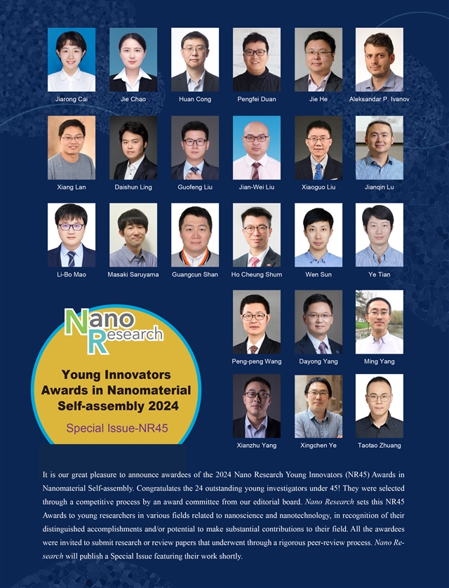 近日,知名国际期刊《纳米研究(英文)》(Nano Research)公布了2024年纳米材料自组装领域纳米研究青年科学家奖 (NR45 Awards)获奖名单。全球共有24位年龄45岁以下的青年学者获此殊荣。同时《纳米研究(英文)》组织了相应的奖项专刊,所有论文均来自本届纳米研究青年科学家奖 (NR45 Awards) 获奖青年科学家研究团队。奖项专刊已于2025年7月期出版,链接为:https://www.sciopen.com/journal/join_journal/stage_page?stage=5&id=1400285564990251009&issueIndex=1922494862210949121&issn=1998-0124