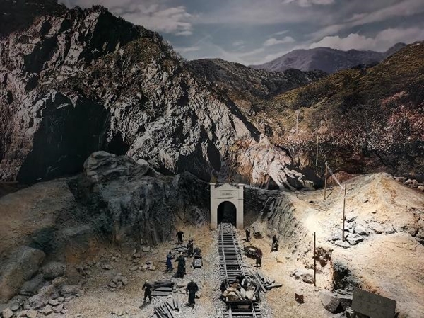 选线沙盘模型以1:2000的比例还原了军都山的复杂地形,直观呈现詹天佑勘测的三条选线方案。观众只需稍作对比,便能领会最终路线方案的精妙之处——它是开挖隧道最短、架设桥梁最少和铺设铁轨长度适中的最优解。
