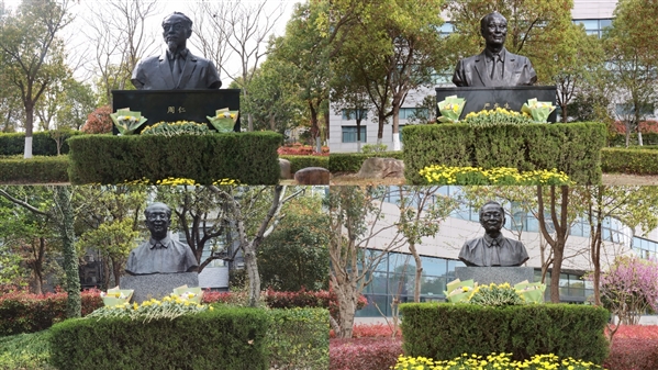 嘉定园区G楼前的周仁雕像(左上)、严东生雕像(右上),“之文楼”一侧的殷之文雕像(左下),“家治楼”一侧的李家治雕像(右下)