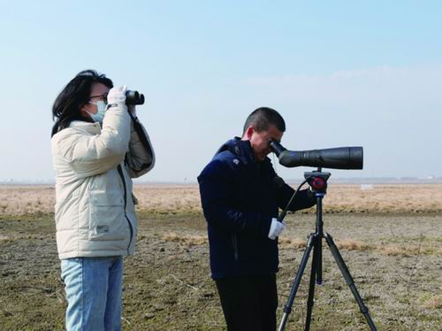▲邹业爱(右)和李冬梅在观察候鸟。