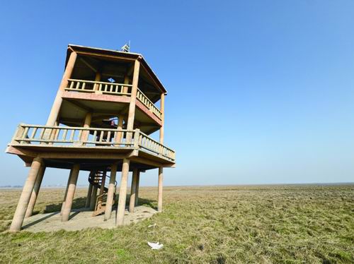 ▲洞庭湖站实验样地里的观鸟塔。王昊昊/摄