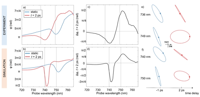 图4 (a-b) 图中显示了静态条件下的φ(蓝色曲线) 和泵到达后 2 ps 的 φ' (红色曲线) 的实验数据和模拟结果;(c-d) 实验(c)和模拟(d)瞬态相变Δφ= φ'- φ;(e-f) 在静态(-1 ps)和扰动(2 ps)条件下,从测量 (e) 和模拟 (f) 中获取的在选定波长下的反射波的偏振椭圆图。
