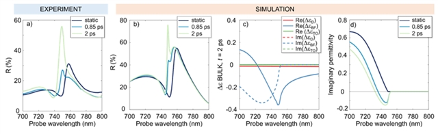 图3 (a) 展示了静态下和泵浦后0.85 ps,2 ps的TM反射光谱图;(b) 图a的模拟仿真结果;(c) 当延迟2ps时,泵浦-探针信号峰对超表面介电常数变化的贡献;(d) 静态下和泵到达后,超表面介电常数虚部的变化。