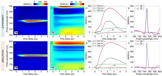 图2 (a-b) 实验(a)和模拟(b) TM差分反射率随时间延迟和探针波长的变化;(c-d) 实验(c)和模拟(d) TE差分反射率随时间延迟和探针波长的变化;(e-f) 不同探测波长下实验(e)和模拟(f) ΔR/R的时间动态响应;(g-h). 实验(g)和模拟(h)在2 ps泵探头延迟下的ΔR/R谱。