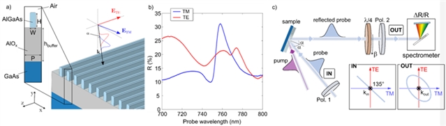 作者团队提出使用AIGaAs纳米线构造超表面结构,并在700~800 nm的波长范围内测量了其在TE和TM偏振状态下的反射光谱图。超表面的各向异性会严重影响其光学响应,从而导致强烈的双折射行为。对于TM偏振,在750 nm的带隙下方 (即758 nm处) 发现了一个明显的共振峰。相反,TE反射率在略长一点的波长 (约770 nm) 处呈现出一个窄的非对称峰值,这可以被识别为准BIC状态。这些特性符合对光偏振的高效切换和合成的需求。同时作者使用偏振分辨超快泵浦探测光谱来表征瞬态二向色性和双折射特性。