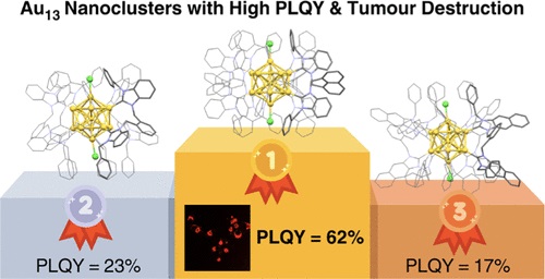 Abstract: N-heterocyclic carbene (NHC)-protected gold nanoclusters display high stability and high photoluminescence, making them well-suited for fluorescence imaging and photodynamic therapeutic applications. We report herein the synthesis of two bisNHC-protected Au13 nanoclusters with π-extended aromatic systems. Depending on the position of the π-extended aromatic system, changes to the structure of the ligand shell in the cluster are observed, with the ability to correlate increases in rigidity with increases in fluorescence quantum yield. Density functional theory analysis reveals that both synthesized Au13 nanoclusters are 8-electron superatoms but have distinct differences in the characteristics of the lowest unoccupied single-electron states. Qualitatively, this implies different mechanisms for excitations and their decay over the fundamental energy gap. Stability and photophysical studies were carried out to provide the emission lifetime and optical purity of the two clusters. Active intracellular uptake of the nanoclusters was confirmed in vitro using confocal microscopy in human epithelial carcinoma cells. Reactive oxygen species production was measured at 7% efficiency. The high cluster stability, photoluminescence quantum yields, and efficient cellular uptake in cancer cells suggest potential for these nanoclusters as highly efficient and tunable nanomedical platforms.