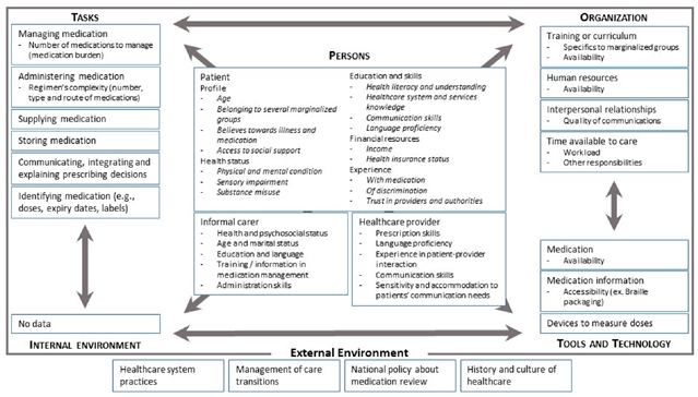 学者尝试借助SEIPS 2.0模型结构化解释边缘化群体药物相关结果中的不平等。该模型强调工作系统由个体、任务、工具与技术、组织、内部与外部环境构成,并通过工作过程影响结果。现有文献多集中于患者、照护者及医护人员因素,尤其是可变因素如教育水平、语言与沟通能力、文化认知、过往经验及社会支持;而健康状况与资源等不可变因素则凸显系统其他要素需适应调整。相较之下,关于环境、工具及任务特征的证据有限,显示研究不足。