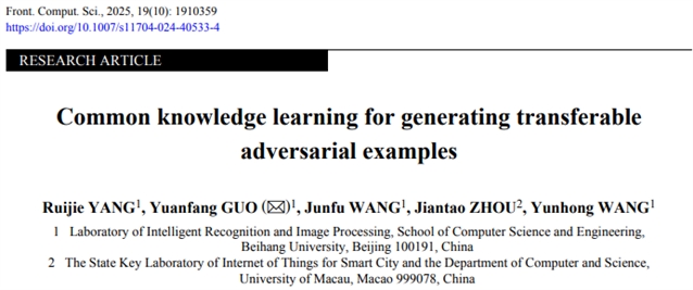 Ruijie YANG, Yuanfang GUO, Junfu WANG, Jiantao ZHOU, Yunhong WANG. Common knowledge learning for generating transferable adversarial examples. Front. Comput. Sci., 2025, 19(10): 1910359