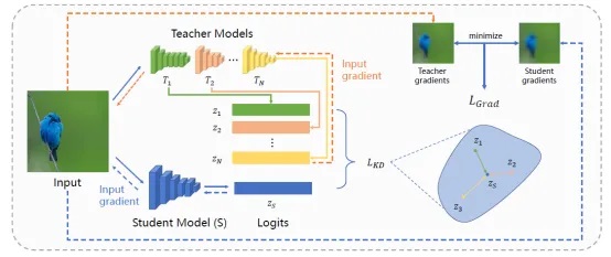 文章提出采用多教师网络模型指导学生模型学习不同模型的通用特征,此外,考虑到输入梯度常被用于对抗样本生成过程,因此在目标函数中添加了输入梯度损失项,提高学生模型与教师模型输入梯度的相似性。随后,用这样训练好的学生模型生成对抗样本。