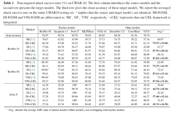 大量实验结果表明,基于本文提出的通用特征学习技术,可以有效提升在对抗样本在目标模型上的攻击迁移性。特别地,我们测试了对抗样本在其他模型(与学生/教师网络模型完全不重叠)上的迁移性,可以看出,我们的方法效果仍比基线方法有很大的提升。