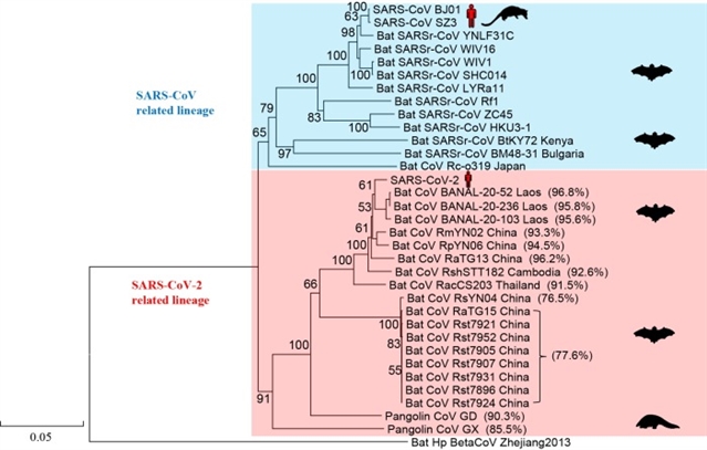 图1 SARS相关冠状病毒全长RdRp基因序列的系统发育分析