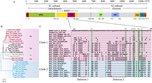 SARS相关冠状病毒的进化分析显示,其刺突蛋白受体结合域(RBD)存在显著多样性,可分为两个主要进化枝(图3)。其中,无缺失的进化枝1病毒(如SARS-CoV-2、BANAL-20-52)能高效结合人类ACE2,而带有缺失的进化枝2病毒则失去此能力。这一发现为预测潜在跨物种传播风险提供了分子依据。