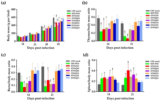 分别感染1日龄SPF鸡,在14和21 d分别采样分析,发现与CEF阴性对照相比,攻毒组体重均无显著差异。随着感染时间延长,35 d时5个攻毒组体重均低于阴性对照,其中HNSD01和HNXZ05感染鸡体重均显著偏低。至42 d时全部7个攻毒组体重均低于阴性对照,其中HNSD01、HNXZ05、HNSQ05、HNSQ01和HNXZ01攻毒组均显著偏低(图1 a)。胸腺指数,14和21 d时7个攻毒组大部分低于阴性对照组,其中HNSD01、HNXZ05、HNSQ05和HNSQ01)显著低于阴性对照组(图1 b)。法氏囊指数,与胸腺指数非常相似,尤其是HNSD01、HNXZ05、HNSQ05和HNSQ01攻毒组在14或21 d均显著偏低(图1 c)。脾脏指数,14或21 d时7个攻毒组均高于阴性对照,其中HNSD01、HNXZ05、HNSQ05和HNSQ01分别在14或21 d均具有显著性差异(图1 d)。