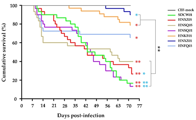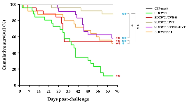 图4.不同MD疫苗免疫/攻毒鸡的存活曲线