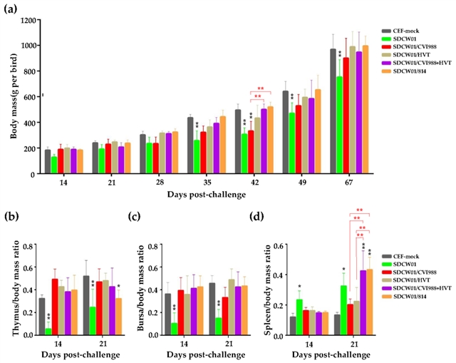 图3. 不同MD疫苗免疫/攻毒鸡的体重及免疫器官指数