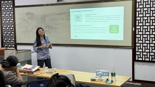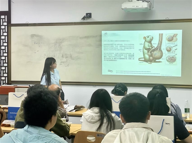 在专题报告环节,MDPI出版人司文华女士围绕“英文科技论文写作指南”展开系统讲解。她从编辑的视角,梳理了从投稿信到参考文献的全流程写作要点。针对当前热点,她特别强调了MDPI对AI工具的使用规范:AI不能作为作者,并在正文和投稿信中必须披露使用细节。她还分享了一个因AI生成插图不当而导致论文快速撤稿的真实案例,提醒大家务必保持学术诚信。另外也借此机会介绍了2026年10月末由Symmetry 期刊共同组织的首届国际现代数学物理会议 (ICMMP 2026) ,引发了在场师生的兴趣。