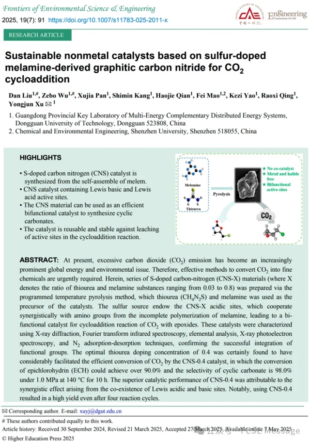 本文内容来自FESE期刊2025年第19卷第7期发表的研究文章“Sustainable nonmetal catalysts based on sulfur-doped melamine-derived graphitic carbon nitride for CO2 cycloaddition”。通讯作者为东莞理工学院徐勇军教授。