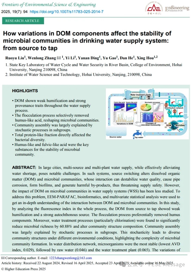 本文内容来自FESE期刊2025年第19卷第7期发表的研究文章“How variations in DOM components affect the stability of microbial communities in drinking water supply system: from source to tap”。通讯作者为河海大学环境学院张文龙教授。