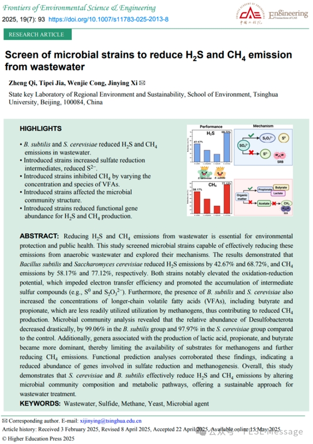 引用格式:Zheng Qi, Tipei Jia, Wenjie Cong, Jinying Xi. Screen of microbial strains to reduce H2S and CH4 emission from wastewater. Front. Environ. Sci. Eng., 2025, 19(7): 93 https://doi.org/10.1007/s11783-025-2013-8