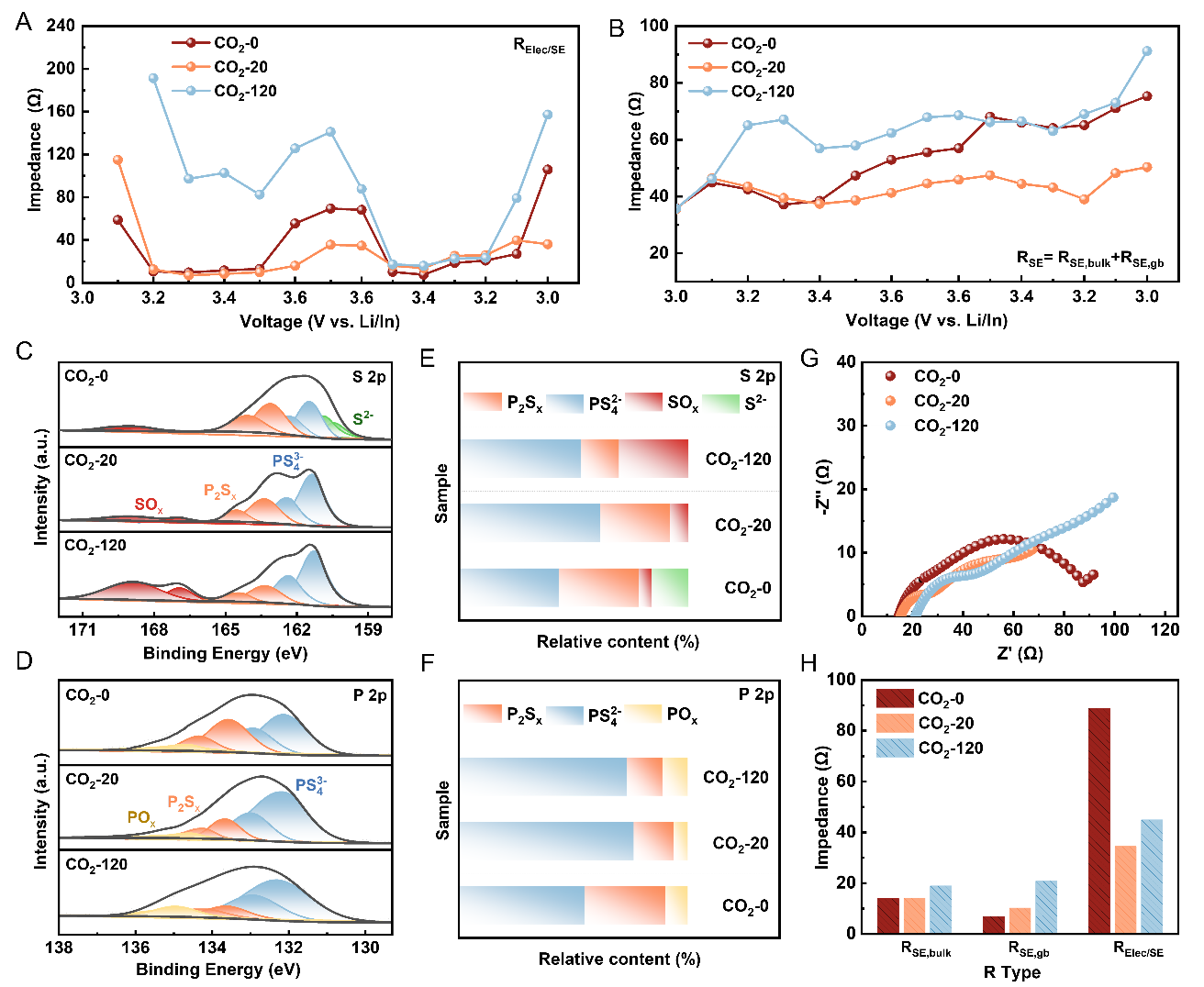 2.破坏电解质:高电压下,过量碳酸锂会分解释放CO2,这些CO2渗入硫化物电解质晶格,加速电解质分解为SOx、POx。原位微分电化学质谱(DEMS)测试发现,处理120分钟的样品,CO2释放量显著增加,电解质阻抗急剧升高;