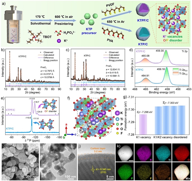 图1 KTPF/C和KTP/C的结构形貌表征。a) KTPF/C和KTP/C的合成示意图。b) KTPF/C和c) KTP/C的XRD图谱的Rietveld精修。d) Ti 2p XPS光谱和 e) 31P 固态NMR光谱。f) 具有无序K1/K2空位分布的K0.75TiO0.75PO4F0.25结构模型和g) 计算的生成能。KTPF/C的h) SEM图像,i) TEM 图像,j) HRTEM 图像,以及k)的元素映射图像(标尺:20 nm)。
