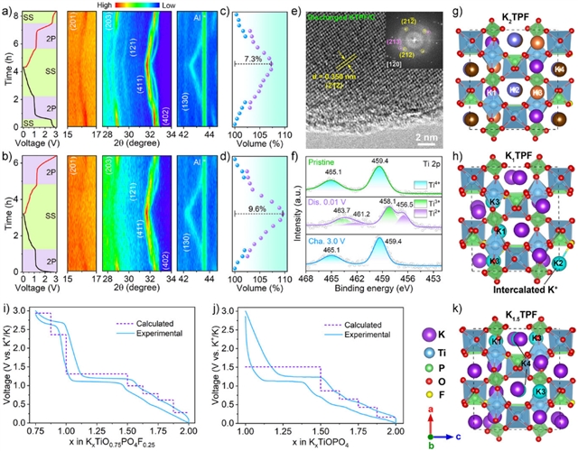 图2 KTPF/C和KTP/C的钾存储机制。a) KTPF/C和 b) KTP/C第二循环的电压曲线和相应的原位XRD二维轮廓图。c) KTPF/C和d) KTP/C基于原位XRD计算的电池体积变化。e) KTPF/C在完全放电状态下的HRTEM图像。f) KTPF/C在不同放电/充电状态下的Ti 2p XPS光谱。KxTPF 在不同钾化状态下的模拟结构模型:g) K2TPF,h) K1TPF,和 k) K1.5TPF。计算电压曲线与实验获得的 i) KTPF/C和 j) KTP/C的放电/充电曲线比较。