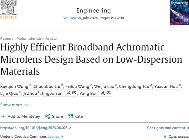 Xueqian Wang, Chuanbao Liu, Feilou Wang, Weijia Luo, Chengdong Tao, Yuxuan Hou, Lijie Qiao, Ji Zhou, Jingbo Sun, Yang Bai. Highly Efficient Broadband Achromatic Microlens Design Based on Low-Dispersion Materials. Engineering, 2024, 38(7): 194–200