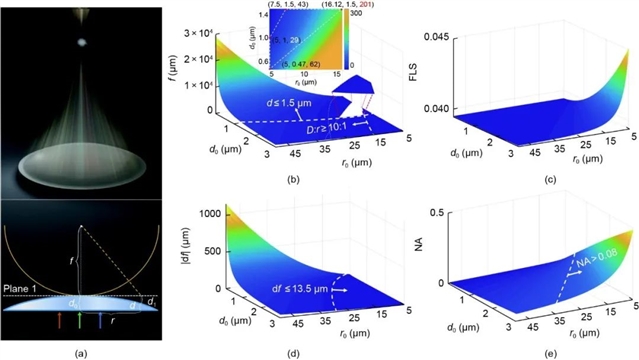 图1 (a)消色差微透镜示意图(上图)。消色差微透镜相位函数的示意图。黄色实线表示聚焦时所需的相位波前(下图)。(b)不同尺寸(r0和d0)的焦距。D∶r = 直径∶径向坐标。(c)不同尺寸(r0和d0)的相对色差 FLS。(d)不同尺寸(r0和d0)的绝对色差|df|。虚线表示根据瑞利判据划分的边界。(e)具有不同尺寸(r0和d0)的透镜的NA值。虚线右侧区域的NA值大于0.08。以上所有参数均以熔融石英为材料进行研究。