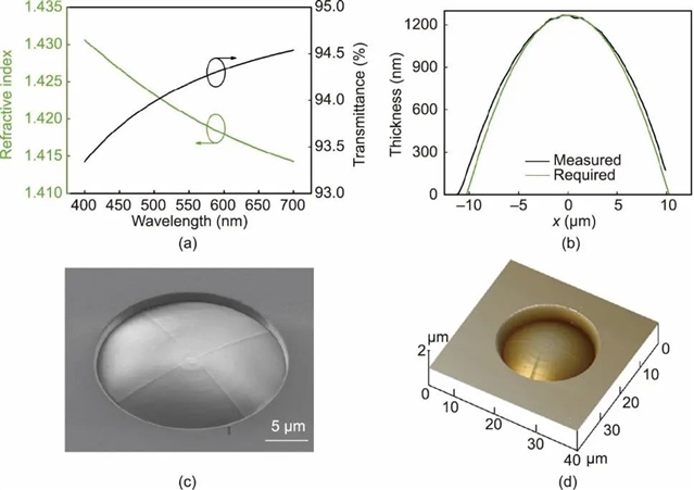 图2 (a)熔融石英在可见光波长下的色散曲线和透射率。(b)从原子力显微镜(AFM)图像中提取D20的实际厚度分布,并对比了使用等式(5)计算的理论厚度分布。制备的消色差D20的SEM(c)和AFM(d)图像,其直径为21.3 μm,中心厚度为1.27 μm,NA为0.109。