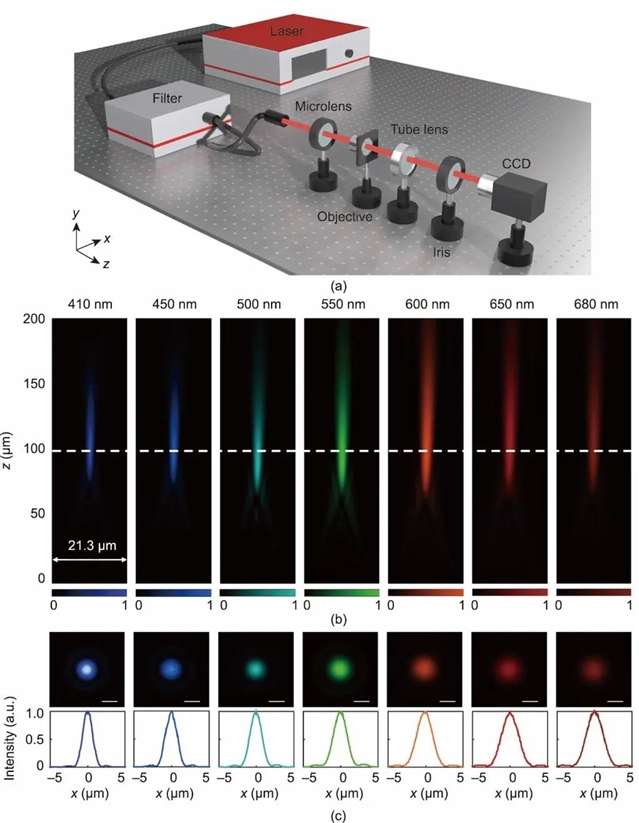 图3 (a)用于消色差微透镜聚焦的光学测量装置示意图。CCD:电荷耦合器件。(b)在410~680 nm的不同波长处,消色差微透镜D20传播平面周围的归一化强度分布。白色虚线表示目标焦距f = 98 μm。(c)消色差微透镜D20在选定波长处的焦平面强度分布。比例尺:2 μm。