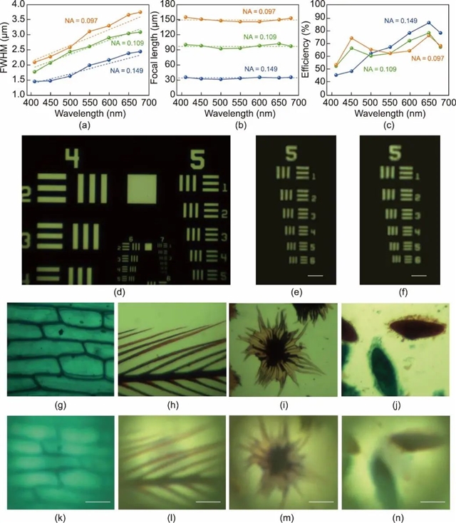 图4 测得的三种不同NA微透镜的半峰全宽(a)、焦距(b)和聚焦效率(c)。(a)和(b)中的虚线分别表示衍射极限和平均焦距。(d)1951年美国空军(USAF)分辨率测试板的图片。(e)、(f)使用D20 (e)和D30(f)消色差微透镜拍摄USAF分辨率测试板第(5)组的图像。比例尺:20 μm。(g)~(j)染色洋葱细胞、鸟羽、浆果绒毛和草履虫的显微镜图像。(k)~(n)使用D20消色差微透镜获得的白光图像。比例尺:50 μm。
