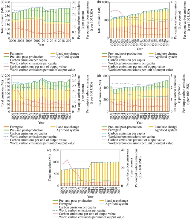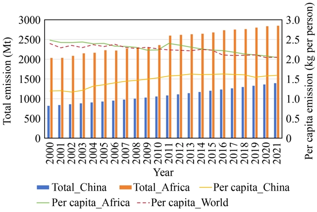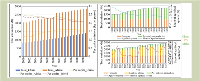 图1 2000–2021年中国和非洲农业食品系统的碳排放总量与人均排放量 (右轴)。