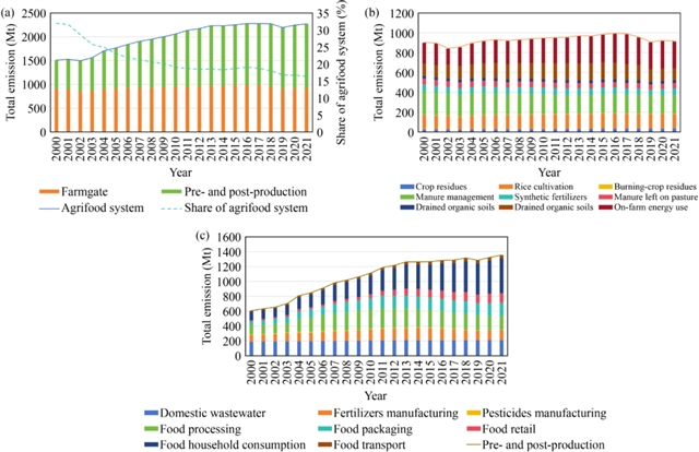 图3 2000–2021年中国农业食品系统碳排放来源。(a) 农业食品系统碳排放;(b) 农业生产;(c) 产前-产后环节。