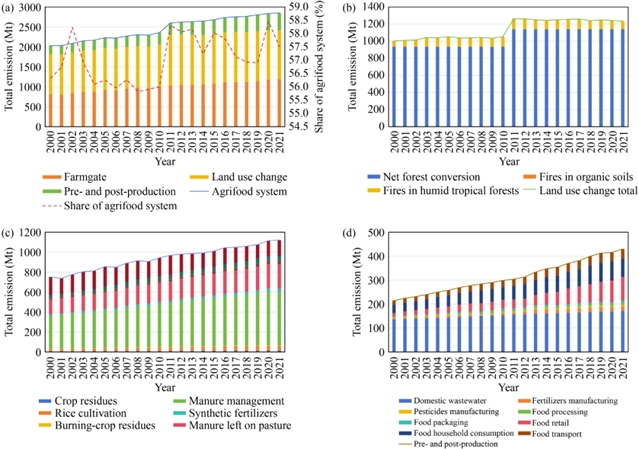 图4 2000–2021年非洲农业食品系统碳排放结构。(a) 农业食品系统碳排放结构;(b)土地利用变化;(c) 农业生产;(d) 产前-产后环节。