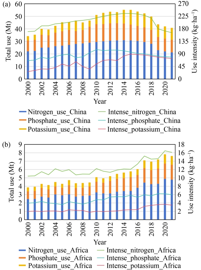 图6 2000–2021年化肥投入量与施用强度 (a) 中国; (b) 非洲。