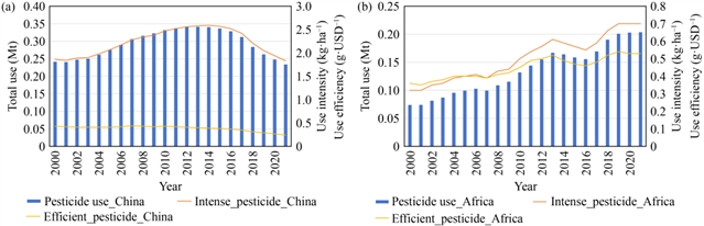 图7 2000–2021年农药投入量与施用强度 (a) 中国; (b) 非洲。
