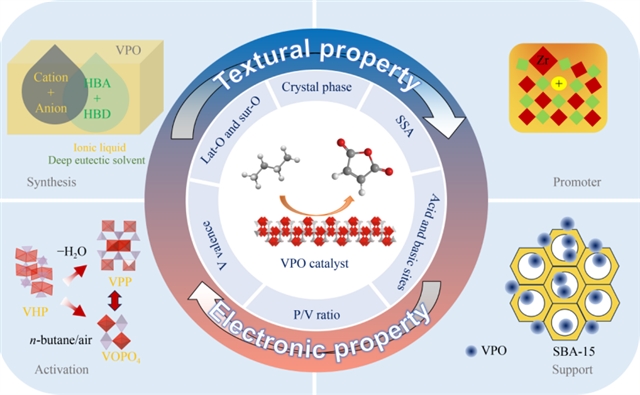 正丁烷选择性氧化制备马来酸酐(MA)被认为是实现轻质烷烃向高价值化工产品转化的有效途径。目前,钒磷氧化物(VPO)因具有丰富的活性位点与氧物种,是正丁烷选择性氧化制备MA反应中应用最广泛的催化剂,但由于正丁烷转化率与MA选择性之间存在固有的“权衡”效应,MA产率受到限制,因此开发高效VPO催化的需求仍十分迫切。本文系统总结了VPO催化剂合理设计与精确调控领域的研究进展,重点关注其理化性质对催化性能的影响规律。更重要的是,详细探讨了先进的合成路线与改性策略,着重阐述了用于调控VPO催化剂几何结构与电子结构的各类方法,并结合结构-活性关系展开分析。最后,讨论了当前VPO催化剂面临的挑战,并提出了未来的研究方向。