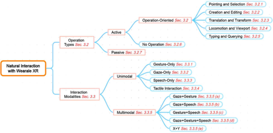 该综述基于应用场景、操作类型和交互模态对交互方式进行了分类。操作类型分为七个类别,区分了主动交互(用户输入信息)和被动交互(用户接收反馈)。交互模态则探索了九种不同类型,从单模态交互(仅手势、眼动、语音或触觉)到各种多模态组合。