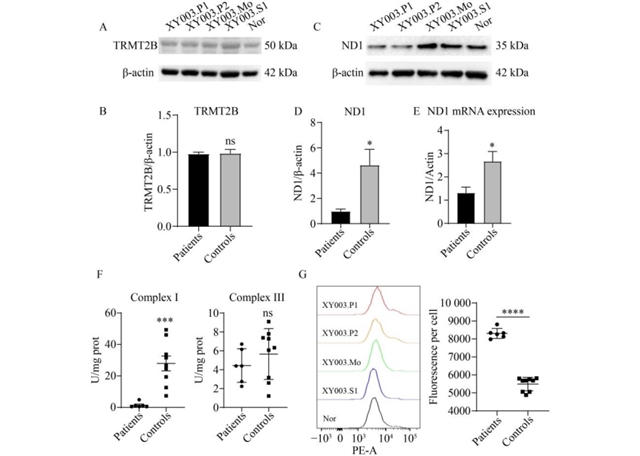 为研究TRMT2B变异对线粒体功能的影响,研究团队构建了两名患者及对照组(包括杂合子母亲、健康姐妹和一名无关健康男性)的淋巴母细胞系。通过透射电子显微镜观察发现,与对照组相比,患者的淋巴母细胞线粒体数量减少,线粒体肿胀(图2)。功能检测显示,患者的线粒体复合物I活性降低,而复合物III活性无显著差异,活性氧水平升高。同时,患者的ND1蛋白和mRNA表达水平降低,而TRMT2B的表达在患者和对照组之间似乎没有变化(图3)。为了进一步探索TRMT2B的功能,研究团队使用慢病毒构建了两个TRMT2B干扰的HEK293细胞系,同样观察到线粒体数量减少和肿胀(图4),ND1表达降低,线粒体有氧呼吸下降,活性氧水平升高(图5)。此外,免疫细胞化学分析表明TRMT2B与线粒体标记物TOMM20共定位,突变的TRMT2B蛋白也位于线粒体内。