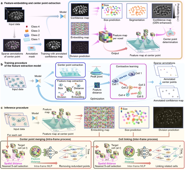 针对上述挑战,清华大学戴琼海/吴嘉敏团队提出了 CELLECT(Contrastive Embedding Learning for Large-scale Efficient Cell Tracking),为三维细胞追踪提供了新的解决路径。该方法首次将对比学习思想引入三维追踪,并直接作用于细胞中心点,以每个细胞中心为单位实现特征学习。在模型结构中,CELLECT 通过多层级的中心点检测模块,同时提取细胞的中心位置、分割区域、尺寸信息以及嵌入特征向量(embedding),使基于图像的检测与基于细胞的对比学习能够在统一框架下优化。由此,细胞在三维空间中大小和形态的差异不再成为限制,模型可一次性获得影像中所有细胞的中心及对应特征,并利用嵌入向量的距离来完成相邻帧间的匹配。在训练过程中,CELLECT 仅需稀疏的中心标注,即可在潜在表征空间中缩小同一细胞在时序中的特征距离,同时扩大不同细胞之间的差异,从而实现高效且稳健的轨迹连接,从而极大地降低了用户使用门槛。这一“中心驱动”的策略显著降低了三维标注的难度,避免了因成像参数差异带来的泛化损耗,对细胞边界模糊与形态变化不敏感,并在跨数据集和跨成像方式的应用中展现出优异的鲁棒性与泛化性能。这一方法不仅比现有最高精度的同类细胞跟踪方法 Linajea[1][2]处理速度快了56倍,同时在国际权威的 Cell Tracking Challenge [3]中的三维活体数据集上(以THU团队名),获得了跟踪与分割双赛道的第一名。