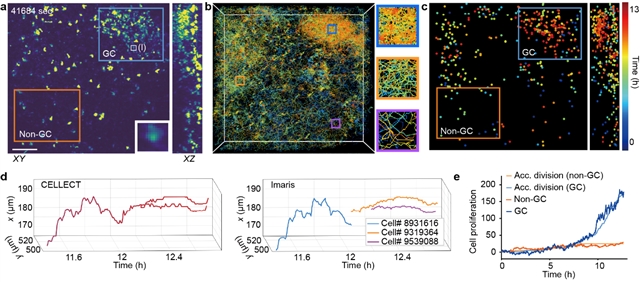 在真实免疫学数据中,研究团队将 CELLECT 应用于小鼠淋巴结的长时程三维成像,重点解析了 B 细胞生发中心的形成过程[4]。生发中心是 B 细胞在免疫应答过程中发生增殖、分化与选择的关键场所,细胞数量庞大且运动活跃,追踪难度极高。研究人员采集了长达 1,352 帧、总量约 260 GB 的双光子合成孔径显微数据,传统方法常因细胞密集和频繁分裂而出现轨迹中断或误判。CELLECT 在无需额外标注的条件下,成功重建了生发中心中细胞的连续轨迹,并能够准确识别分裂事件。不同于传统软件在分裂处容易出现错误切割,CELLECT 的结果保持了轨迹的连贯性和完整性。这一成果不仅降低了免疫学研究中的数据处理门槛,还使得生发中心的动力学特征能够被系统量化,从而为理解适应性免疫应答机制提供了全新工具。