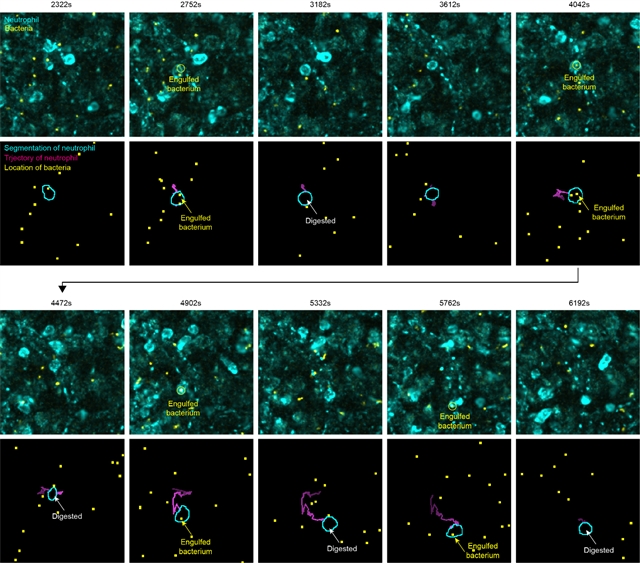 图4.单个中性粒细胞对细菌的吞噬事件观测和记录