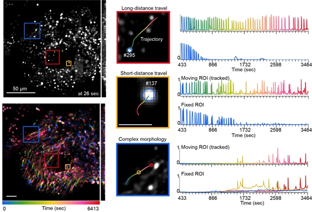 图5. 果蝇神经元塌陷情景下的跟踪效果。原始图像(左上)塌陷过程的时序投影(左下)典型跟踪样例(右)