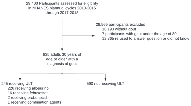 本研究采用横断面设计,整合NHANES 2013–2014、2015–2016和2017–2018三期调查数据,纳入年龄≥30岁且经医生诊断为痛风的成年人共835例。降尿酸治疗定义为在过去30天内使用别嘌呤醇、非布索坦、丙磺舒或复方制剂,并通过药物档案中经药瓶验证的处方信息确认用药情况。