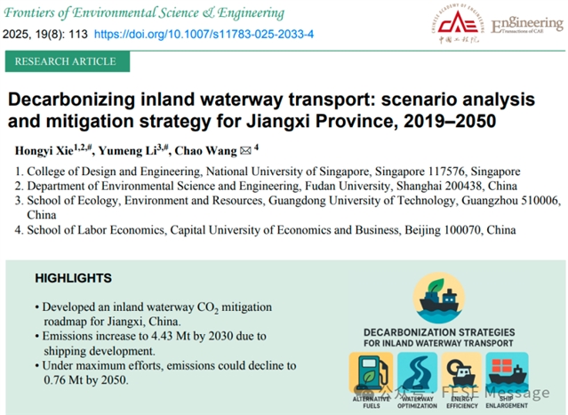 本文内容来自FESE期刊2025年第19卷第8期发表的研究文章“Decarbonizing inland waterway transport: scenario analysis and mitigation strategy for Jiangxi Province, 2019–2050”。通讯作者为首都经济贸易大学劳动经济学院王超博士。