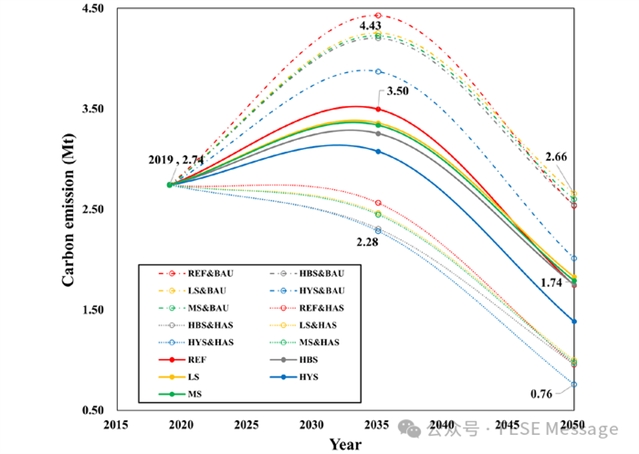 情景设置方面,研究设计了5种船舶动力模式情景(柴油情景REF、混合动力情景HBS、液化天然气情景LS、氢燃料情景HYS、甲醇情景MS)和2类技术改进梯度(常规情景BAU与高强度减排情景HAS),通过蒙特卡洛模拟分析10000组参数组合下的排放趋势(图2)。结果显示,在所有模拟情景下,碳排放均呈现“先增后减”的倒U型特征:基准情景下,2035年碳排放将达峰值4.43 Mt,2050年回落至2.66 Mt;而在氢燃料+高强度减排(HYS&HAS)情景下,2050年碳排放可降至0.76 Mt(图3)。